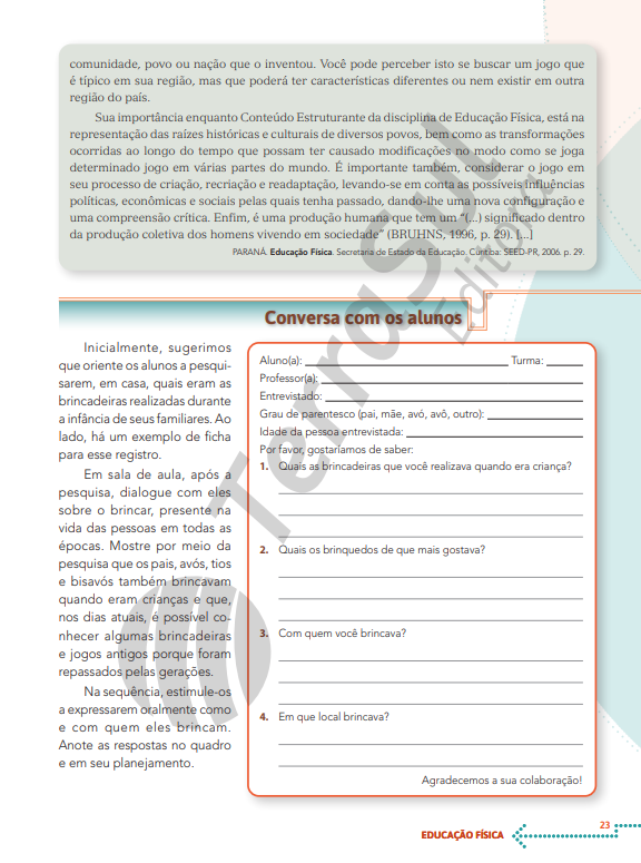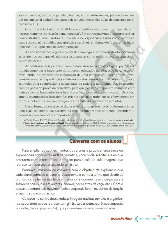 A proposta deste manual é mostrar a Educação Física como um componente curricular que trata do ser humano nas suas manifestações culturais relacionadas ao corpo, em que os movimentos são intencionalmente construídos como uma forma de comunicação com o outro pela linguagem corporal. O encaminhamento do material está organizado em duas partes. A primeira – Orientações gerais – descreve a trajetória da Educação Física através do tempo, identifica as principais tendências pedagógicas no contexto escolar e aponta para uma metodologia que amplia a visão biológica ou técnica, entendendo o aluno como ser humano eminentemente cultural. Nessas orientações, também a avaliação é concebida como instrumento de reflexão sobre a prática pedagógica e o desempenho dos alunos. A segunda parte – Orientações específicas e propostas de atividades – apresenta sugestões metodológicas para tratar das manifestações da cultura corporal de movimento dentro da escola, organizadas como unidades temáticas de Brincadeiras e Jogos, de Ginásticas, de Danças, de Esportes e de Lutas, conforme o documento da Base Nacional Comum Curricular (BNCC). As atividades propostas são objetivas e bem direcionadas, conciliando os conteúdos e as imagens para melhor desenvolvimento das práticas orientadas. Para tanto, a abordagem teórico- pedagógica adotada pela obra possibilita que você elabore seu trabalho de maneira dinâmica.